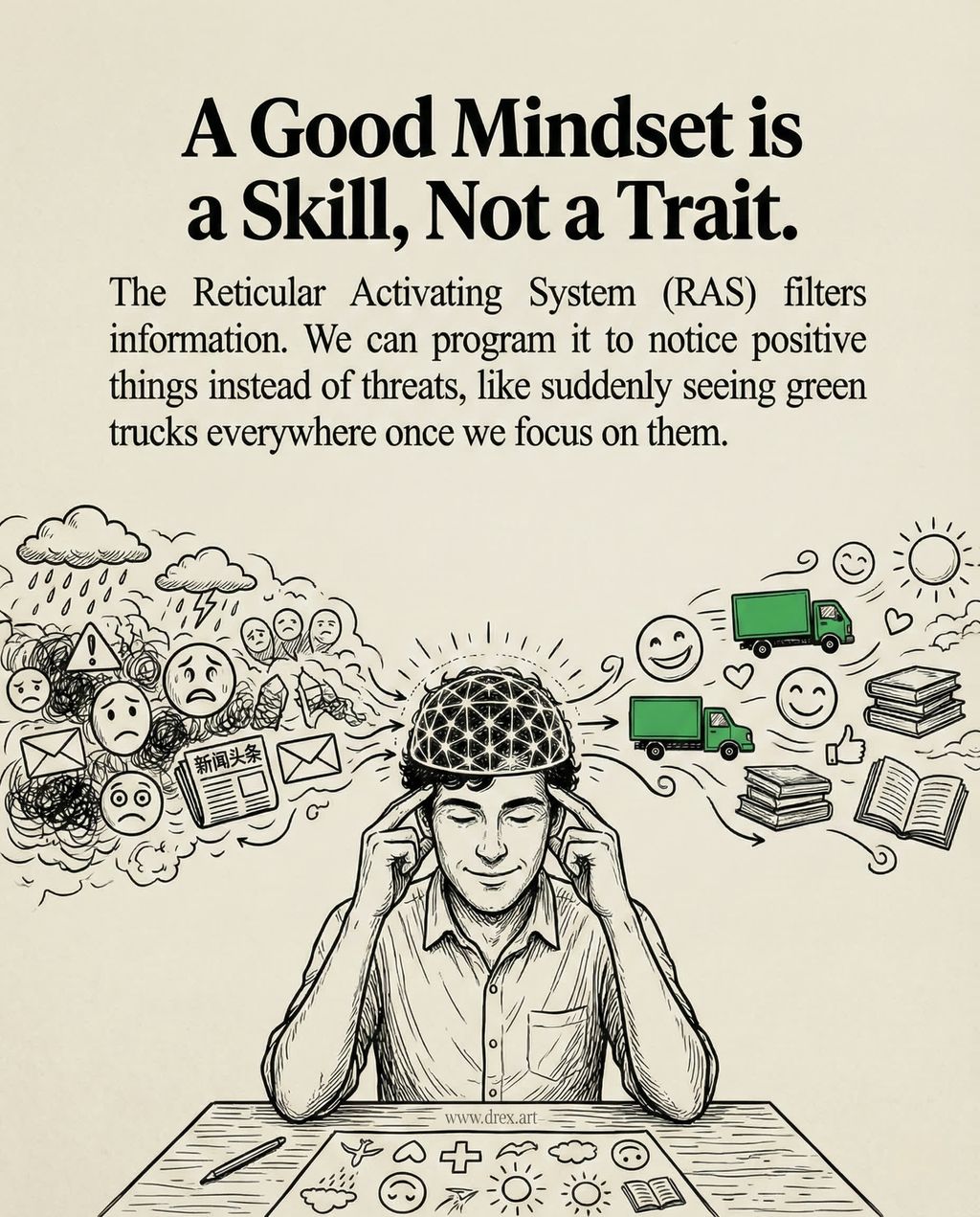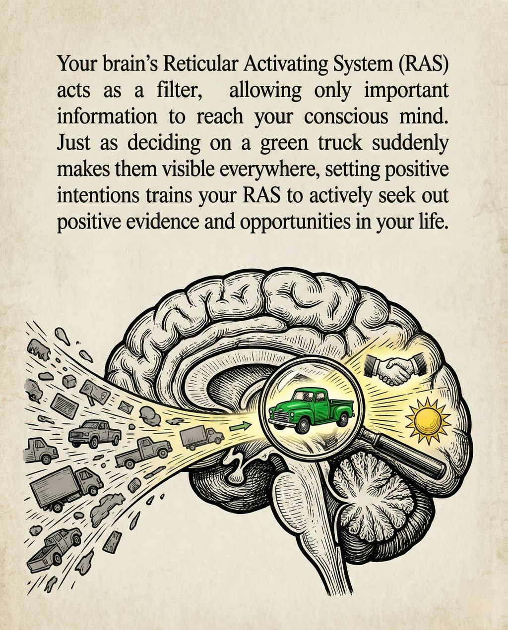 视频的核心概念围绕着“网状激活系统”(Reticular Activating System, RAS)展开。Mel 用“绿色皮卡车”的例子生动地解释了 RAS 的过滤功能:如果你不告诉大脑什么是重要的(比如积极的事物),大脑就会将其过滤掉。但这八句话能充当新的指令,强迫大脑去寻找美好的一天、期待酷的事情发生,并确认自己有能力应对挑战。
