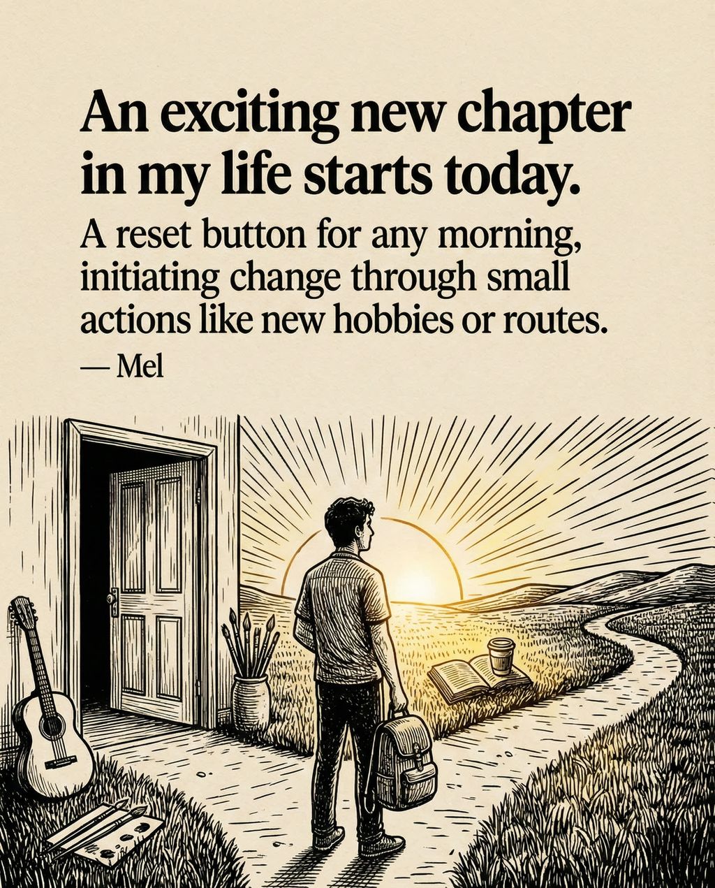 “激动人心的人生新篇章从今天开始。”(An exciting new chapter in my life is starting today) 这是一个随时可以按下的“重启键”。很多人认为必须等到分手、毕业或搬家才能开始新篇章,但 Mel 提醒我们,只要你愿意,任何一个早晨都可以是新篇章的开始。