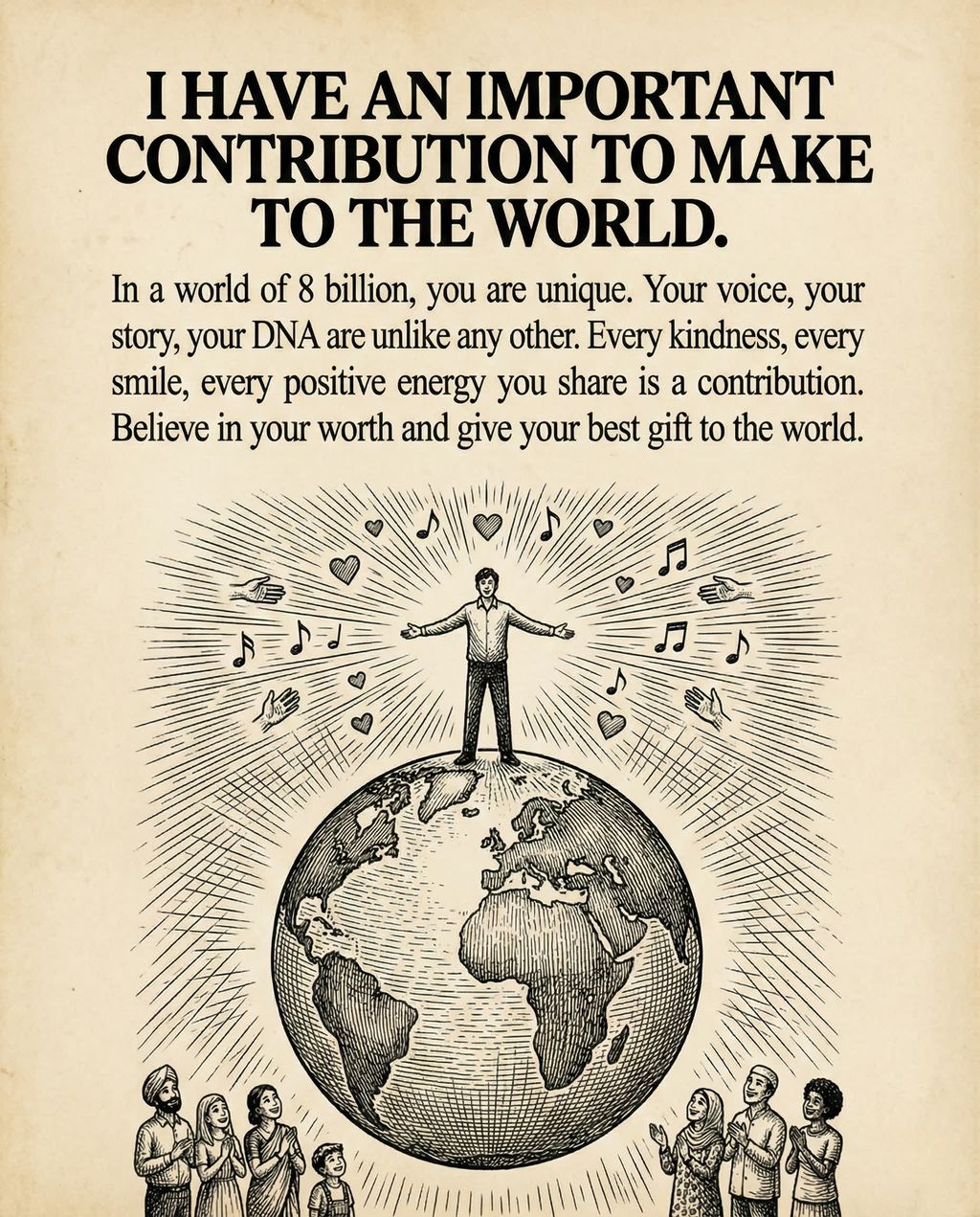 “我对这个世界有重要的贡献要在这个世界做出。”(I have an important contribution to make to the world) 这是最深刻的一句。在这个拥有 80 亿人口的星球上,你是独一无二的——你的声音、你的故事、你的 DNA 无人能及。即使你觉得目前一事无成,你对他人的善意、你的微笑、你所传递的能量,都是对世界的贡献。这句话旨在唤醒你的自我价值感,消除“隐形人”的感觉。当你相信自己的存在有意义时,你会更自信地与世界互动,而这种正向的能量本身就是对周围人最好的礼物。