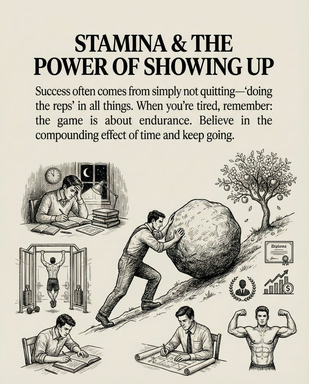 “只要我坚持出现,生活就会奖赏我。”(If I keep showing up, life will reward me) 这是关于耐力(Stamina)的真言。很多时候,成功只是因为“没有放弃”。Mel 将其称为“做重复的动作(Doing the reps)”。