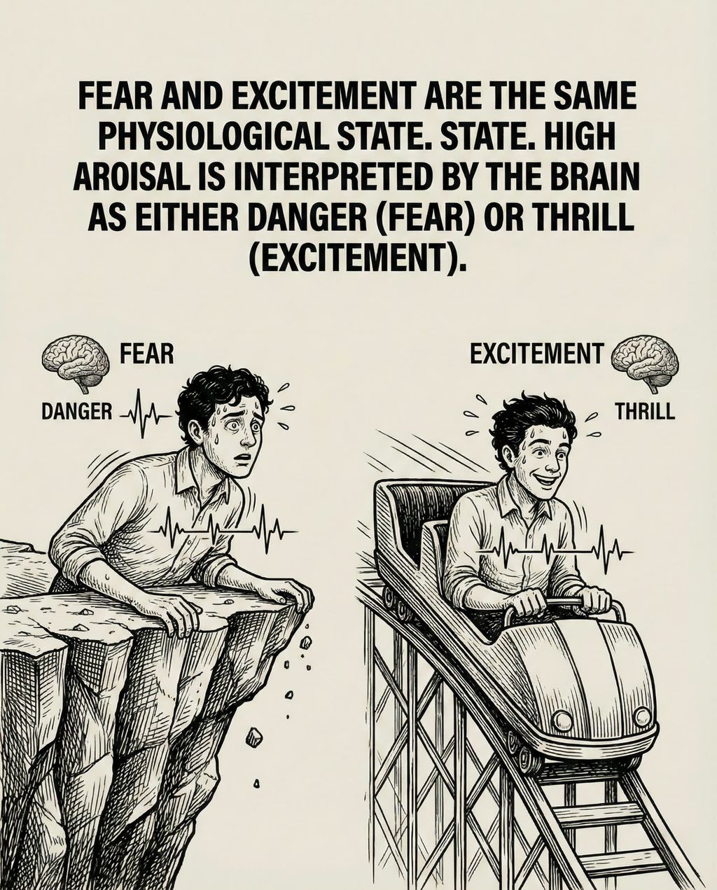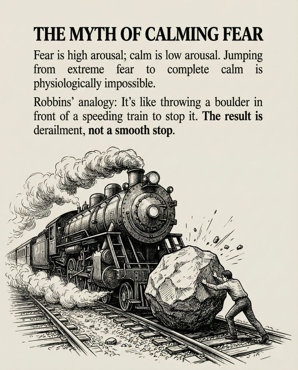 Robbins 强调了一个核心科学事实:恐惧和兴奋在生理状态上是完全相同的。无论是恐惧还是兴奋,身体都会经历心跳加速、出汗、皮质醇激增等“高唤醒”状态。唯一的区别在于大脑如何解释这种身体反应——是将其标记为“危险”(恐惧)还是“刺激”(兴奋)。因此,传统的建议如“冷静下来”或“积极思考”往往无效,因为要求身体从极度激动的“高唤醒状态”瞬间切换到放松的“低唤醒状态”是非常困难的,这就像试图用一块石头去拦停一辆高速行驶的火车,只会导致灾难。