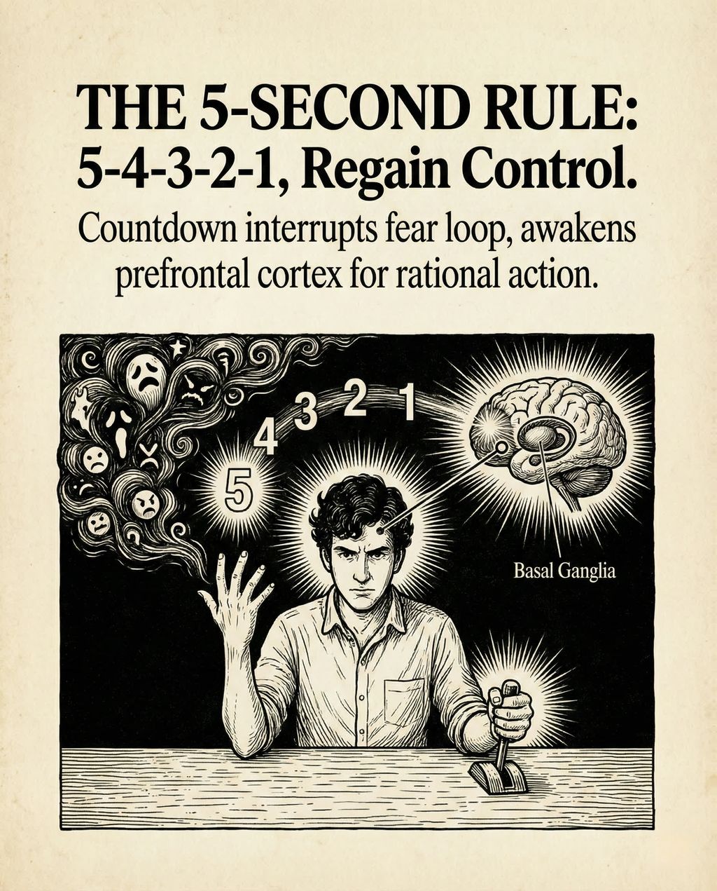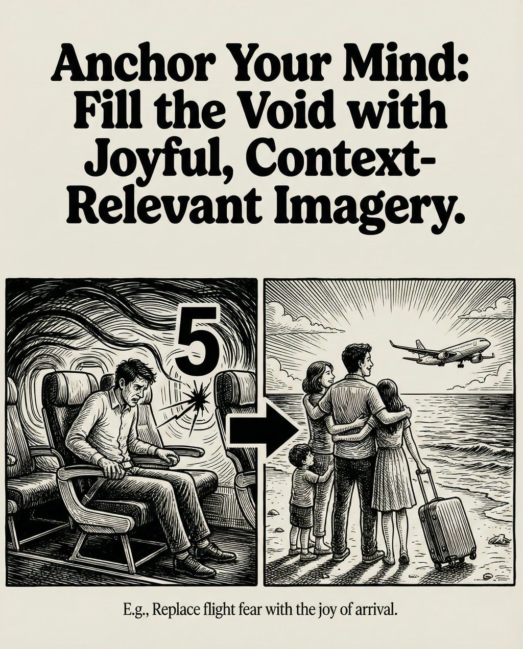 为了解决这个问题,Robbins 提出了一种结合了“5秒法则”(The 5-Second Rule)和“锚定思维”(Anchor Thought)的策略。通过倒数 5-4-3-2-1,我们可以激活前额叶皮层,打断恐惧的惯性思维;紧接着,利用一个与当前情境相关的、积极的“锚定思维”来重新构建大脑的认知。这种方法并不试图消除身体的激动反应,而是顺势将其重新定义为“兴奋”。通过 Mel 自己在后台准备演讲时的亲身经历,以及她克服飞行恐惧的案例,视频生动地展示了如何利用这一技巧“欺骗”大脑,将恐惧转化为兴奋,从而夺回对行动的控制权。