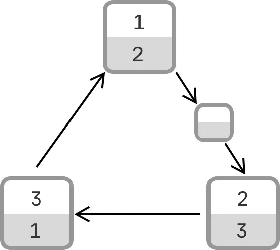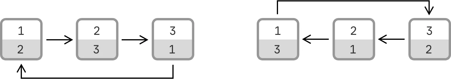 如果是 4 个抽屉有几种放法呢?这个新的抽屉可以出现在原先 3 条链的其中一条链,每出现在其中一条链,就有 2 种放法,所以 4 个抽屉就有 3*2 = 6 种方法形成一个环。