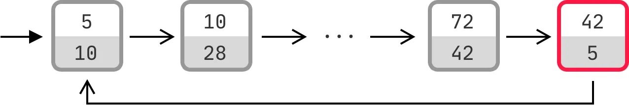 假设囚犯拿到的数字还是 5,他打开序号为 5 的抽屉(一定要打开跟自己序号对应的抽屉,不能随机挑一个,可以带着这个问题往下看),然后一路按照数字与抽屉序号这种对应方式,来到了环形链表的最后一个抽屉前,打开它,里面放的就会是想要找的数字:5。