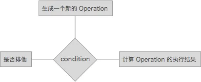 Condition,也就是条件,它可以被附加到 Operation 上,只有当 Condition 被满足时,Operation 才能被执行。比如只有在有网络的情况下才能进行交易,这时「网络状况」就是附加给「交易」的 Condition。