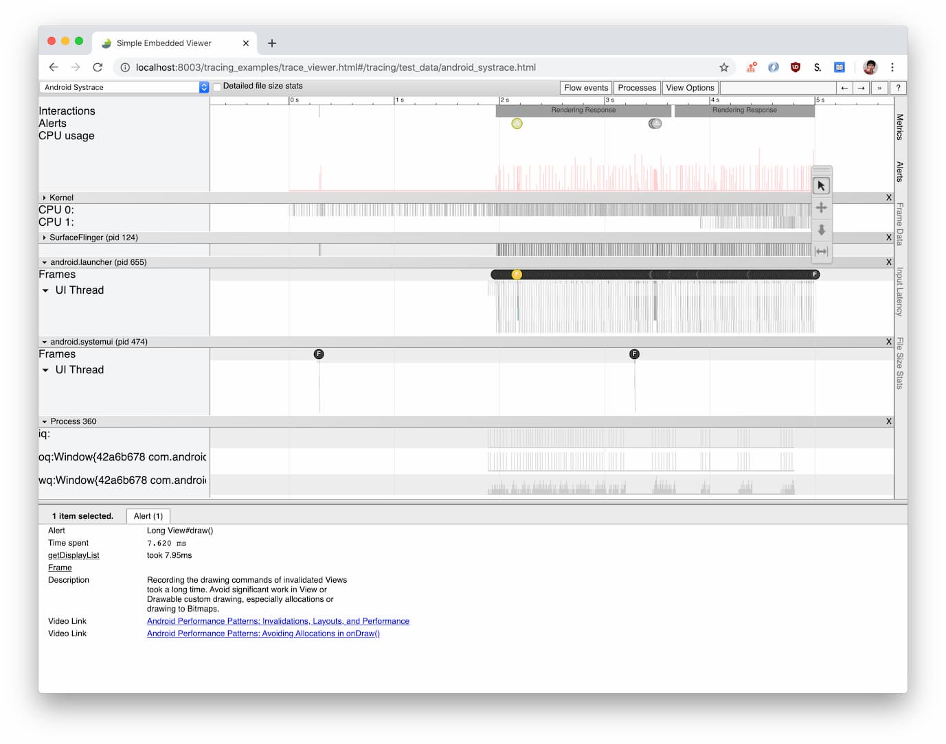 about:tracingand Androidsystrace. providing rich analysis and visualization capabilities for trace files, supporting both the linux kernel trace format and Chrome’s base/trace_event.