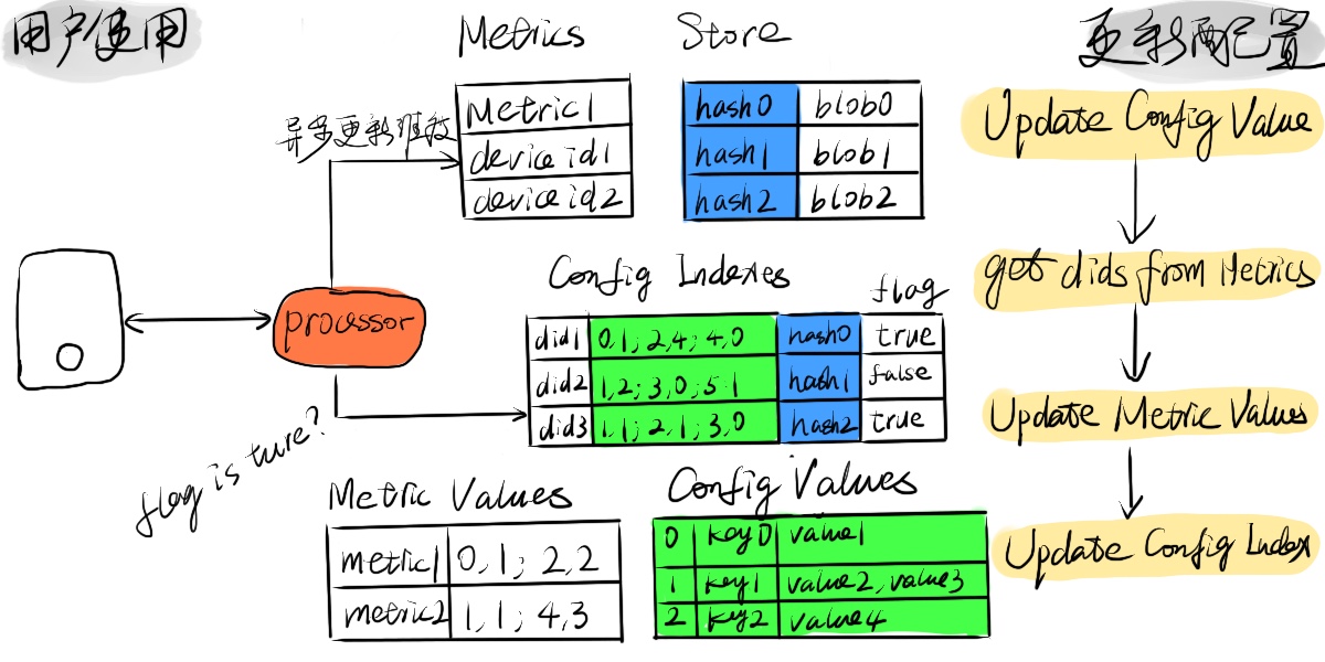 一个设备的 K/V 对通常不会超过 100 项,每对 Size 不超过 1K,也就是一台设备对应的大小上限为 100K 左右,假如设备数为 100 万,就需要 100G 的磁盘空间。这个量还是有点大的,可以优化下。考虑到一些配置项会在多个设备共存,可以把这些配置单独存储,然后把 hash 值作为 Value。假设 Key 的 size 为 30 字节,Value 为 10 字节,这样就只需 40M 的 K/V 存储空间。因此由于存储上的限制,我们的设计也要做一下调整:
