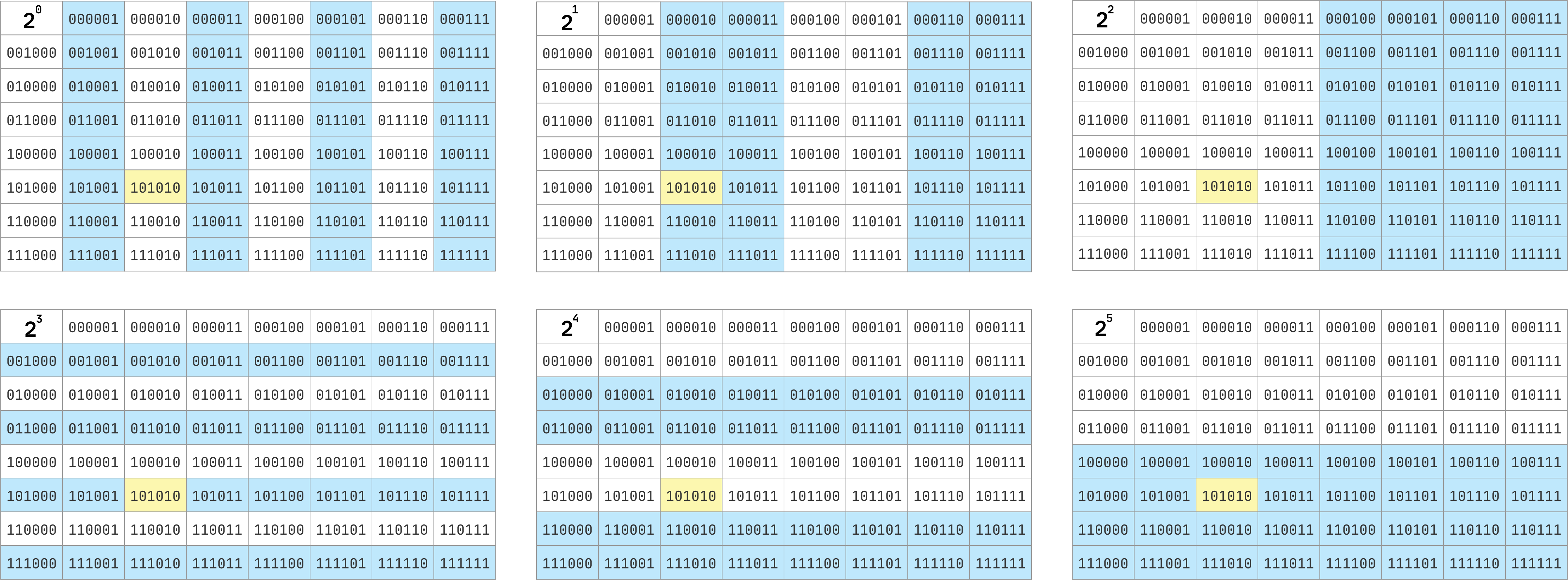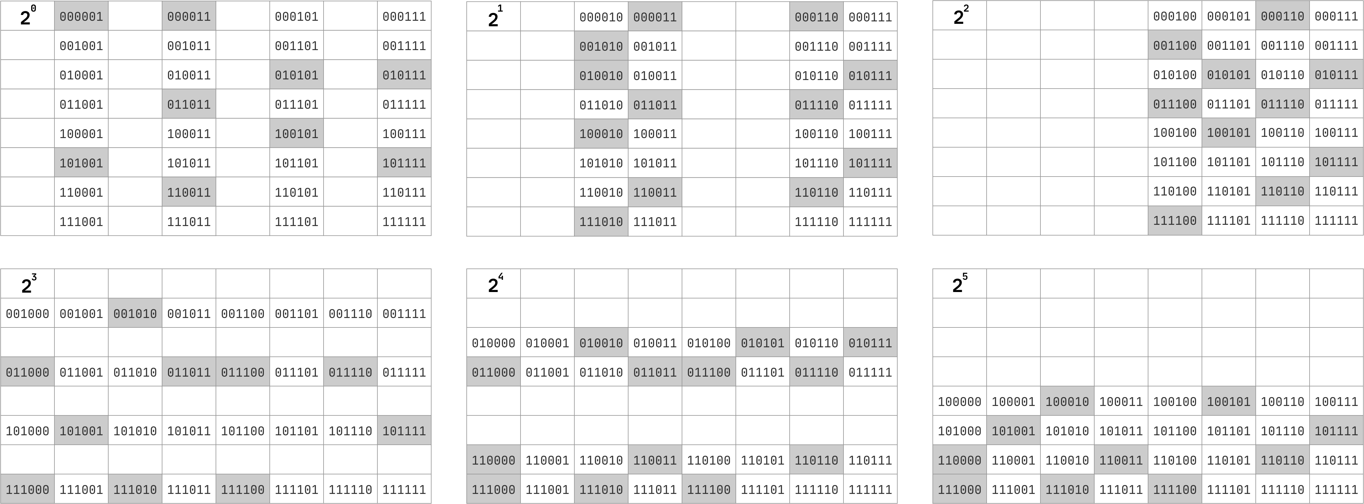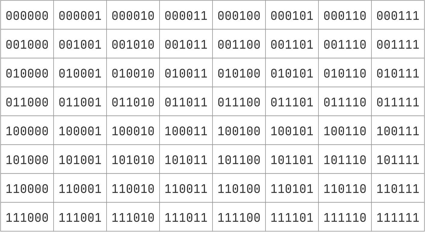 理想状态自然是每个组之间没有重叠,然后将各自组的其中一枚硬币翻转,但这样最多需要翻转 6 次(原始二进制数和目标二进制数各位都不相同)。所以一定会有交叉,那如何交叉才能使得所有可能的翻转组合都被覆盖到呢?如果用 1 表示翻转,那么二进制表示的 64 个数字,不就是所有可能的翻转组合么?