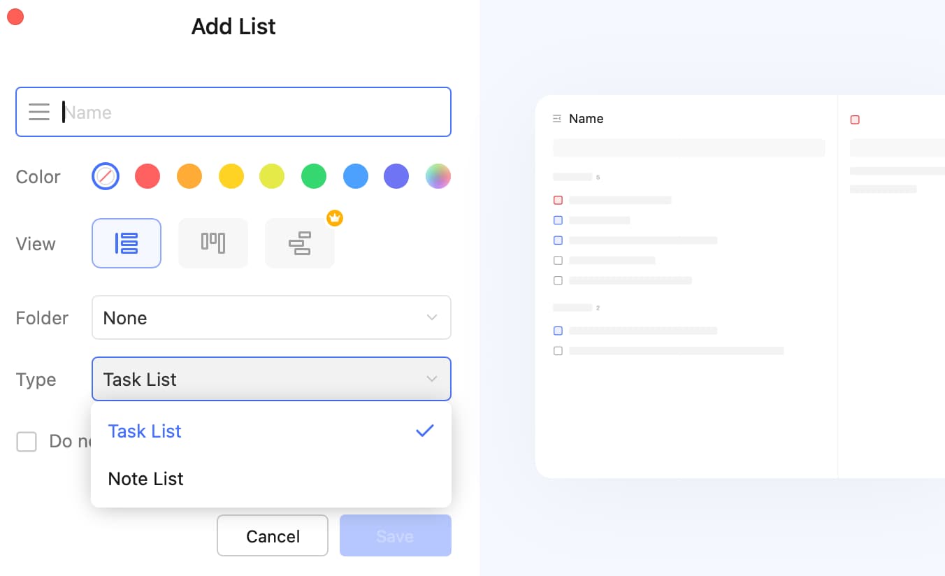 一个项目是具有高度相关性的任务的集合,在 TickTick 里新建项目很简单:新建一个 List, Type 选 Task List 即可(不太明白什么场景下会需要新建一个 Note List)。