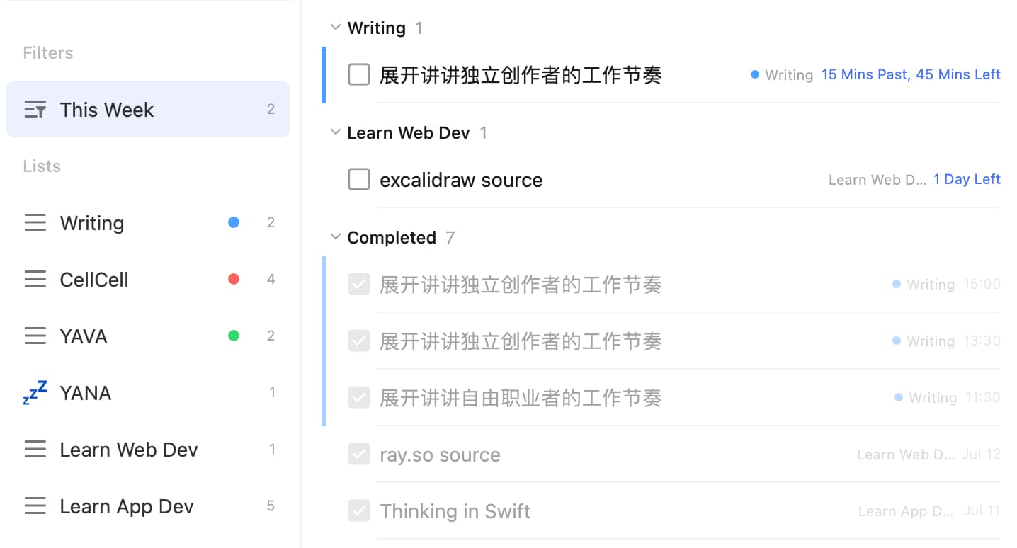 对于独立创作者来说,「周」是一个很好的时间单位。一周的时间足够短,不需要花很多时间在任务编排上,出现问题(比如任务安排过多或过少)也可以及时回顾和纠正;一周的时间又足够长,可以完成几个 Feature 或修复一些 Bug。