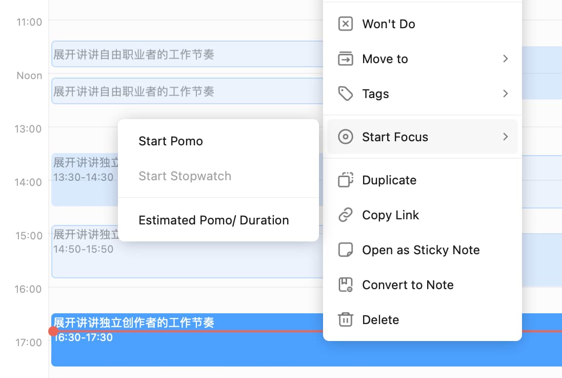 今天要做的任务从周任务列表中去取,并安排到对应的 Time Block 中,要做某个任务时,打开内置的番茄时钟进行记录,很方便。一天下来后,就能看到任务的实际完成情况与预期完成情况的对比。