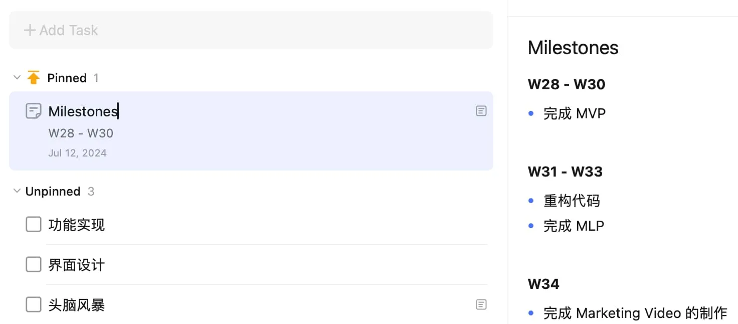 对于一个项目,需要有 Milestone 和 Task,TickTick 可以方便地将一个 Task 转成 Note,这个 Note 可以用来罗列 MileStone。