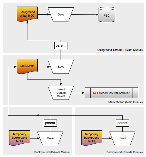 我对这种实现方式的一个困惑是:child 无法得知 parent 的变化,也就是说,如果 NSFetchedResultsController 绑定了 Main MOC,当 Background Write MOC save 时,NSFetchedResultsController 为何能知晓?求指点。