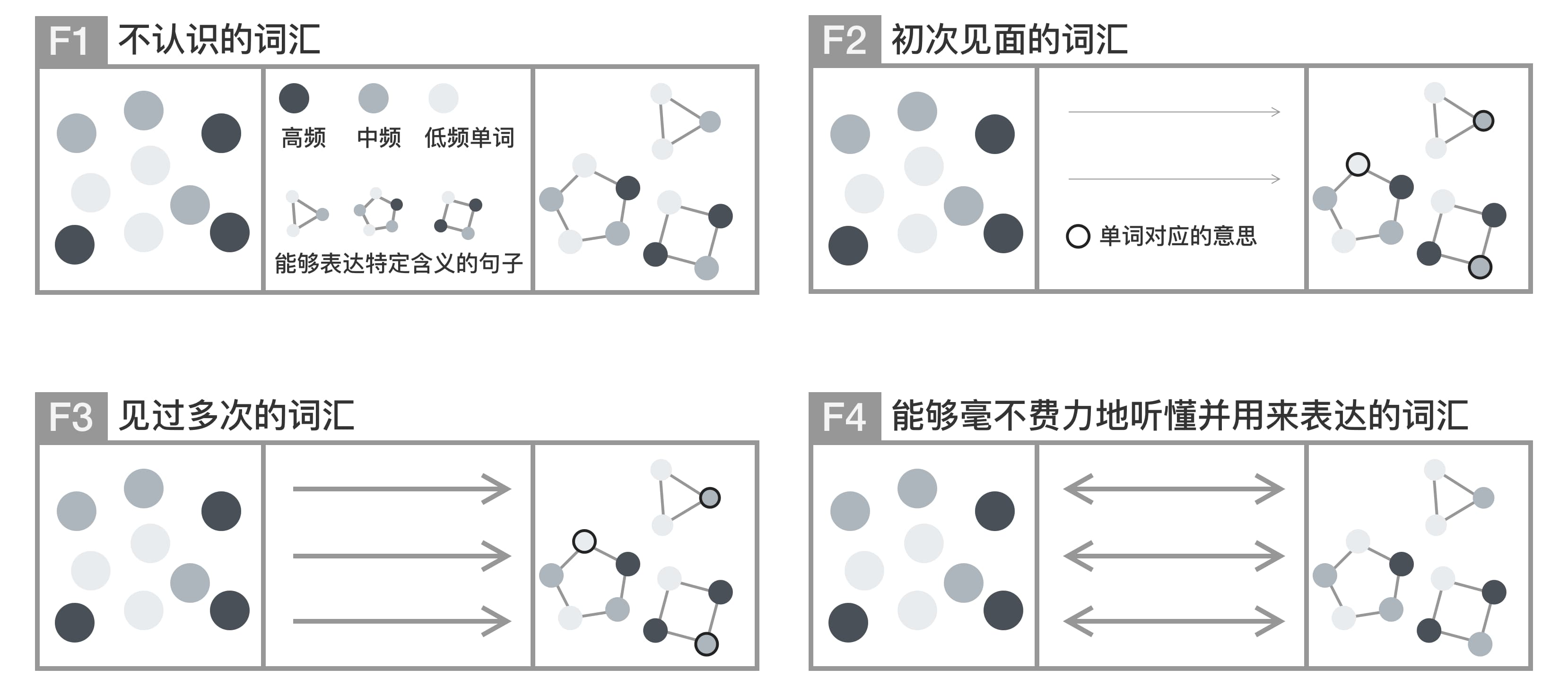 F1: 不知道它们存在的词汇。F2: 见过一次的词汇。F3: 多次遇见的词汇。F4: 可以被用来不费力表达的词汇。