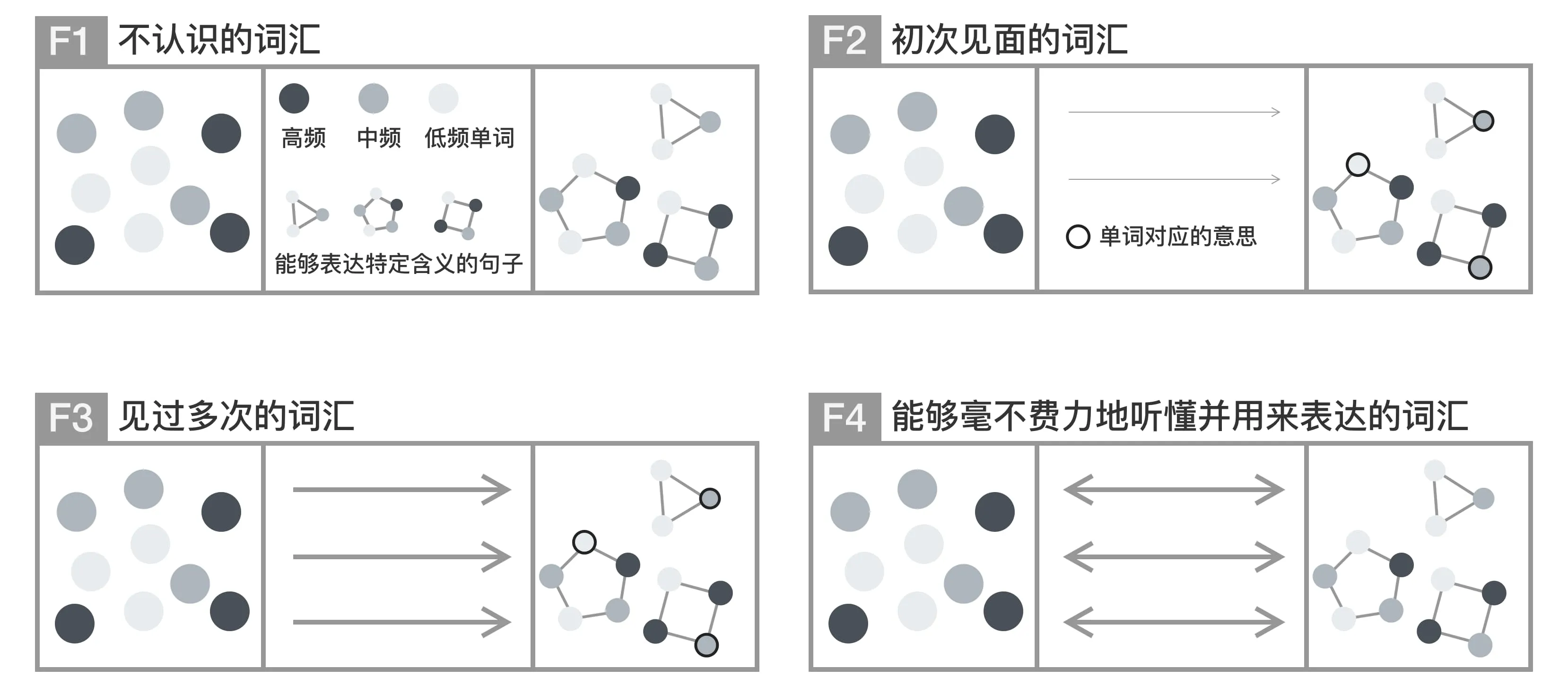 要让这个词汇库丰富起来,会经历四个步骤。分别命名为 F1