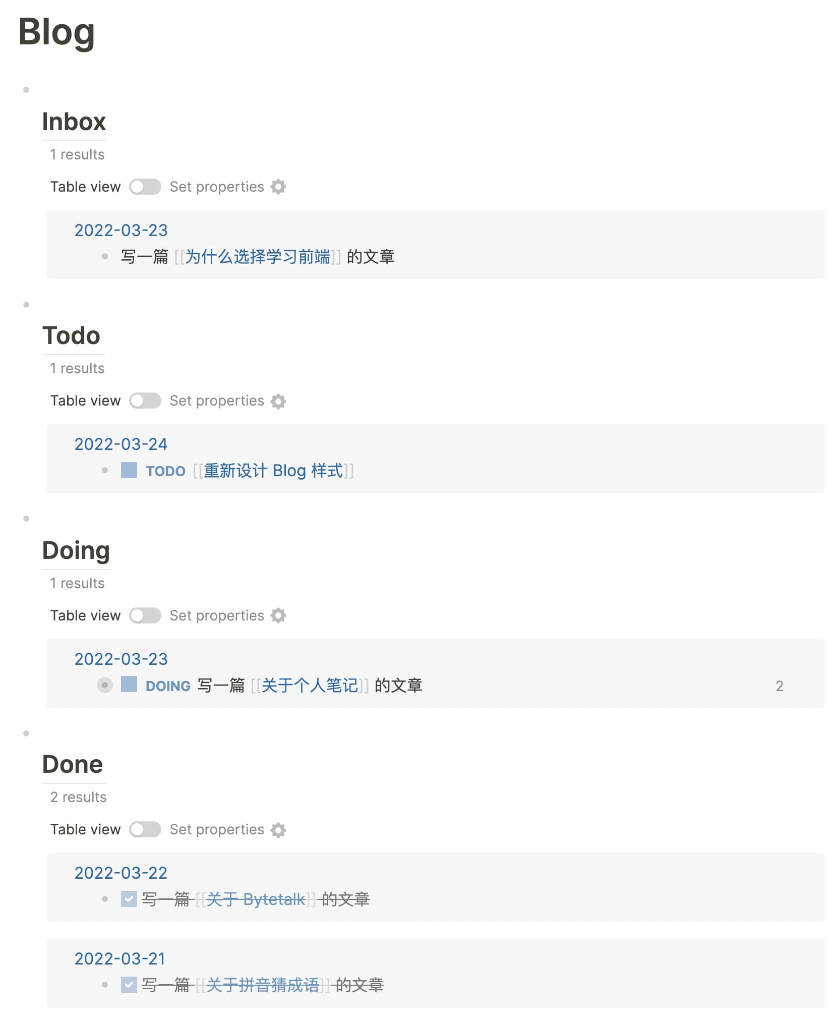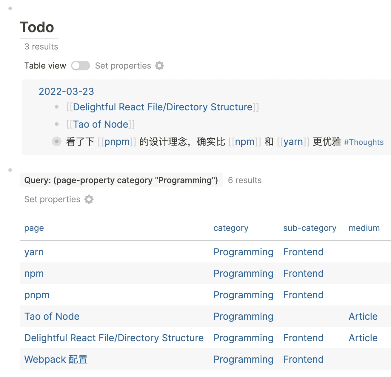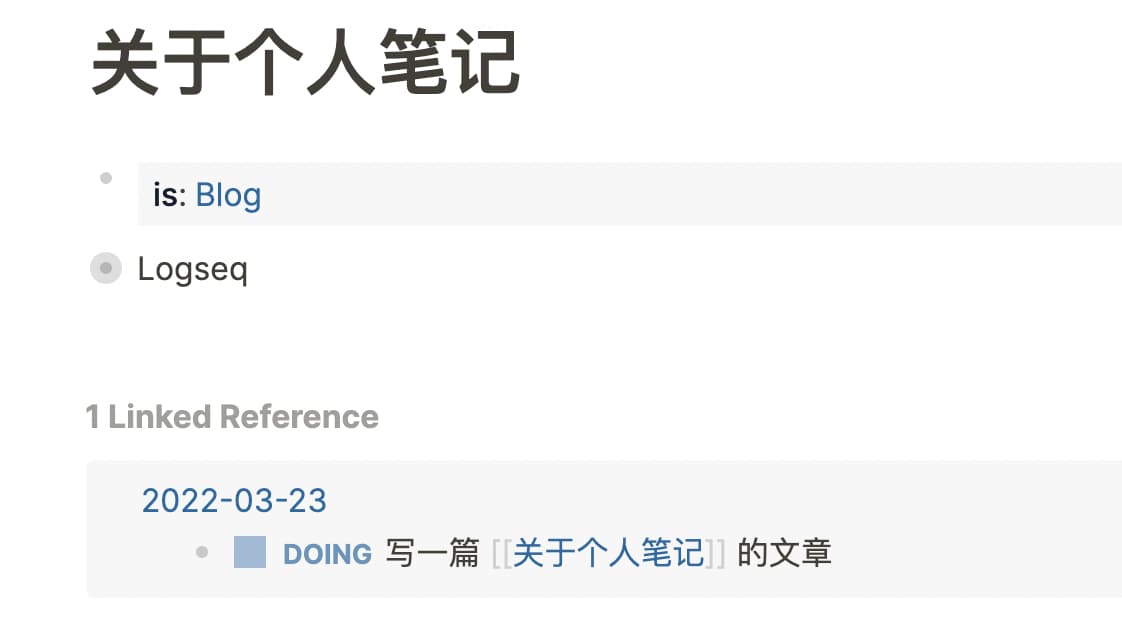 上图中,关于个人笔记这个页面就有一个 is 的属性,该属性的 value 是 [[Blog]]。结合 Advanced Query 可以实现一些很方便的效果。