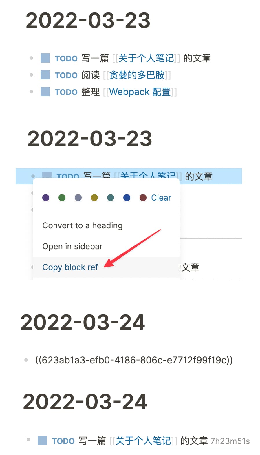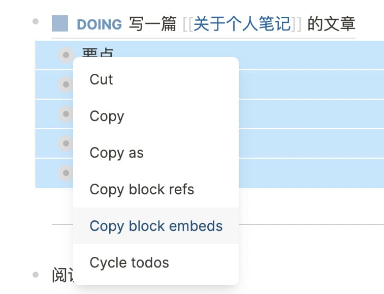 展开的内容就记在 Block 下,这样回顾时也方便知道每天都记了哪些内容。但这样会比较零散,其他 Block 再引用该 Page 时,只能看到内容分散在不同天的 Block 下。这里有一个 Tip 是使用 Copy block embed。将每天记录的内容 Copy block embeds