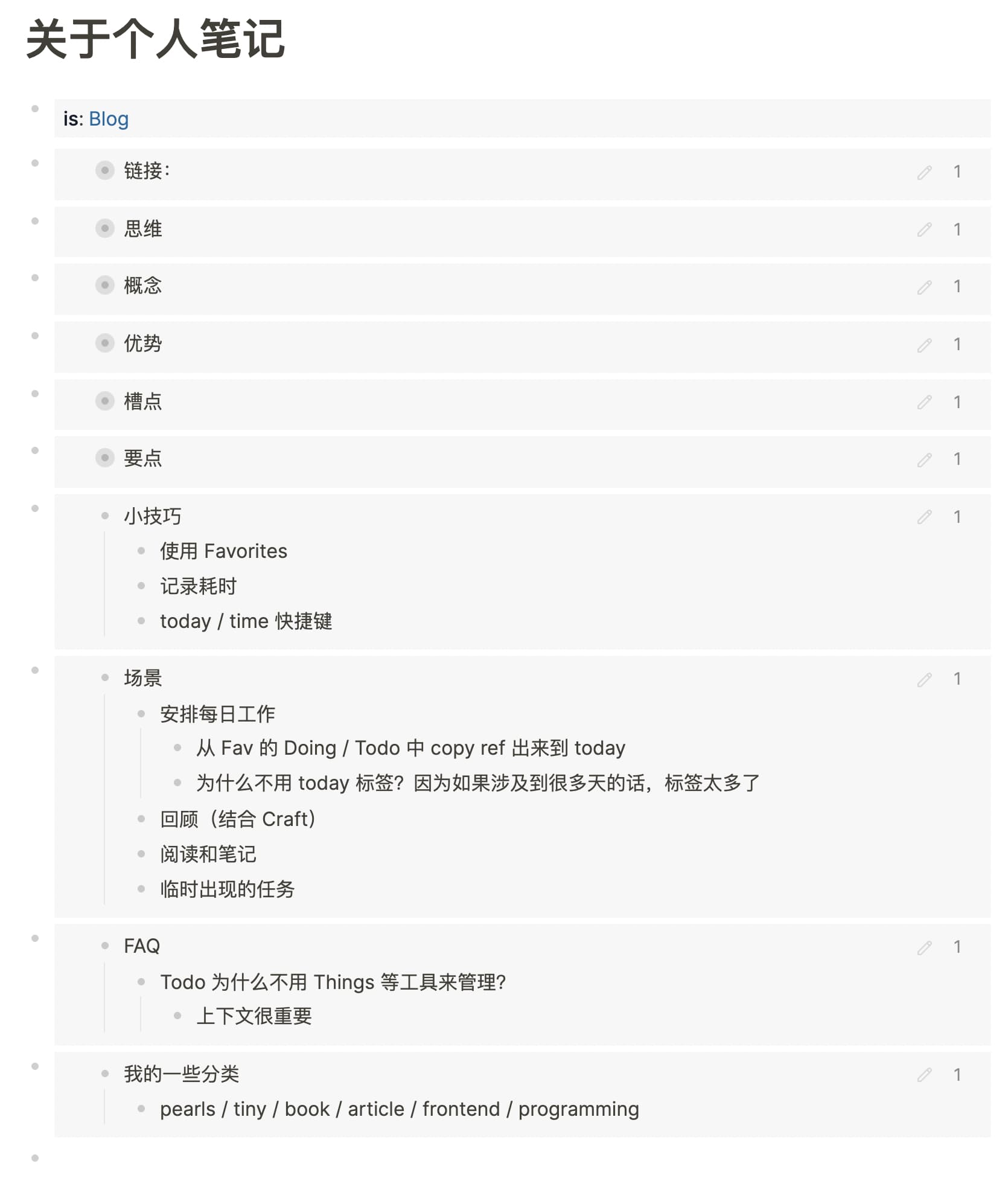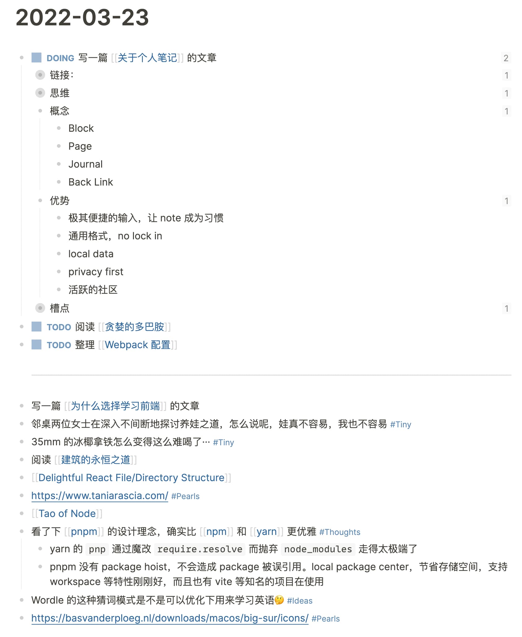 - 极低的记录门槛。每天会自动新建 Journal,然后直接写就行了。Outline 模式也让输入变得非常轻量。