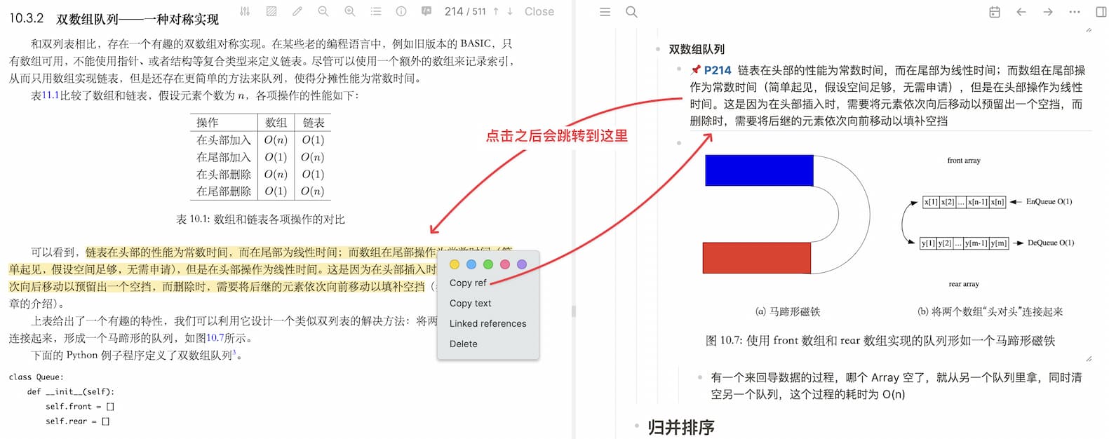 这是 Logseq 的又一个亮点,通过命令 /Upload an asset 上传 PDF 文件后(其实就是将文件拷贝到 Logseq 在本地的目录),点击该文件可以左右分栏,左边是 PDF 电子书,右边是笔记区。阅读过程中,如果有想记录的内容,可以先在 PDF 中高亮,然后右键选择 copy ref,在 Block 中粘贴,就能引用到这些文字了。相比传统的复制粘贴,copy ref 的内容点击后,可以回到 PDF,进而查看更多的上下文。也可以方便地加入自己的 Comment