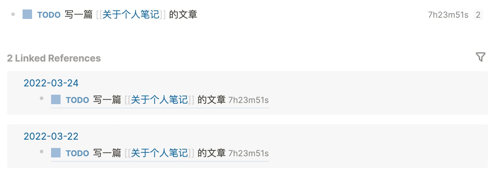 所有有 Tag 或 Page 的 Block 都会被聚合在一起,同时还会带上日期,这个非常方便。