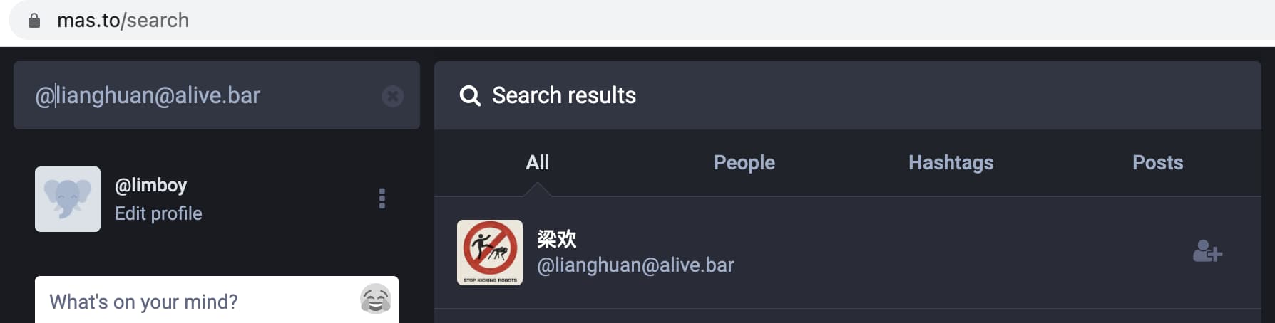 每个 fediverse 用户都会有一个 handle(类似 email address),如 @[email protected],搜索这个 handle 就能找到对应的用户。比如我在 mas.to 实例,而梁欢在 alive.bar 实例,在 mas.to 里搜索 @[email protected] 就能找到他,并关注。