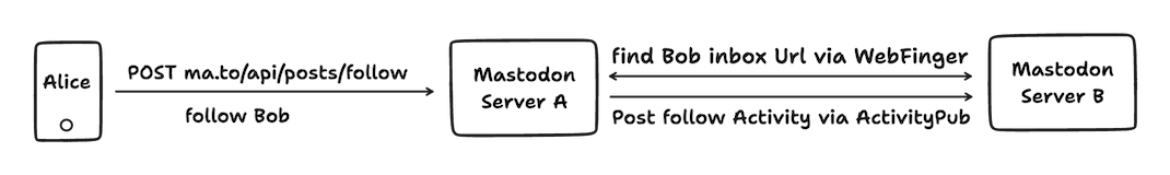 就像一封邮件,actor 是发送者,to 是接收者,object 是 post 内容。假如 Mastodon Server A(以下简称 MSA)上的用户 Alice,想要 follow Mastodon Server B(以下简称 MSB)上的用户 Bob,可以这么做: