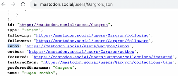 这个 https://msb.com/users/bob 就是 bob 的 profile URL。但这还不够,毕竟我们要往 bob 的 inbox 去发送数据,还需要知道 bob 的 inbox URL。这个也很简单,只要在 profile URL 后面加上 .json 就行了。比如要获取 Gargron 这个用户在 mastodon.social 上的 inbox URL,可以请求 https://mastodon.social/users/Gargron.json,结果中就会有这个 inbox URL