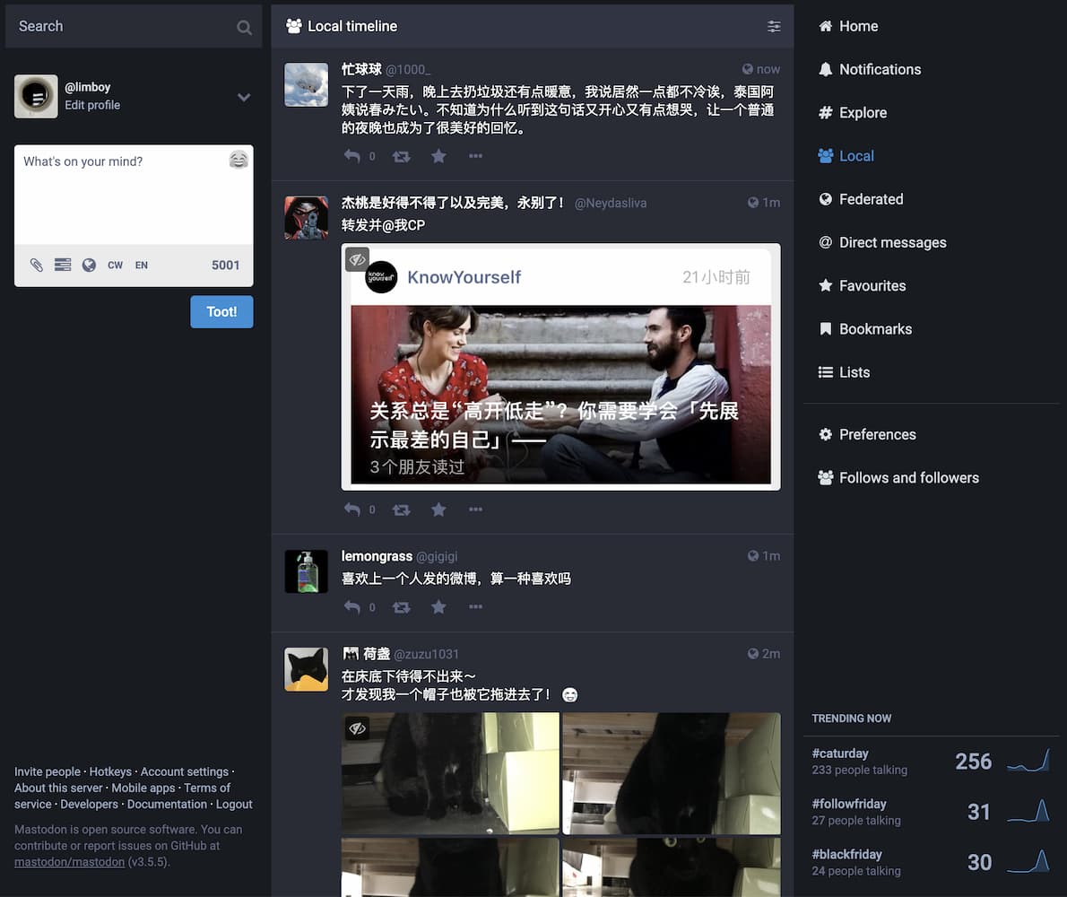这三条 Timeline 中,Local Timeline 是一个能够找到新朋友,发现新内容的好去处(前提是该 Mastodon 实例人不要太多,不要太 General),就像浏览 subreddit 一样。