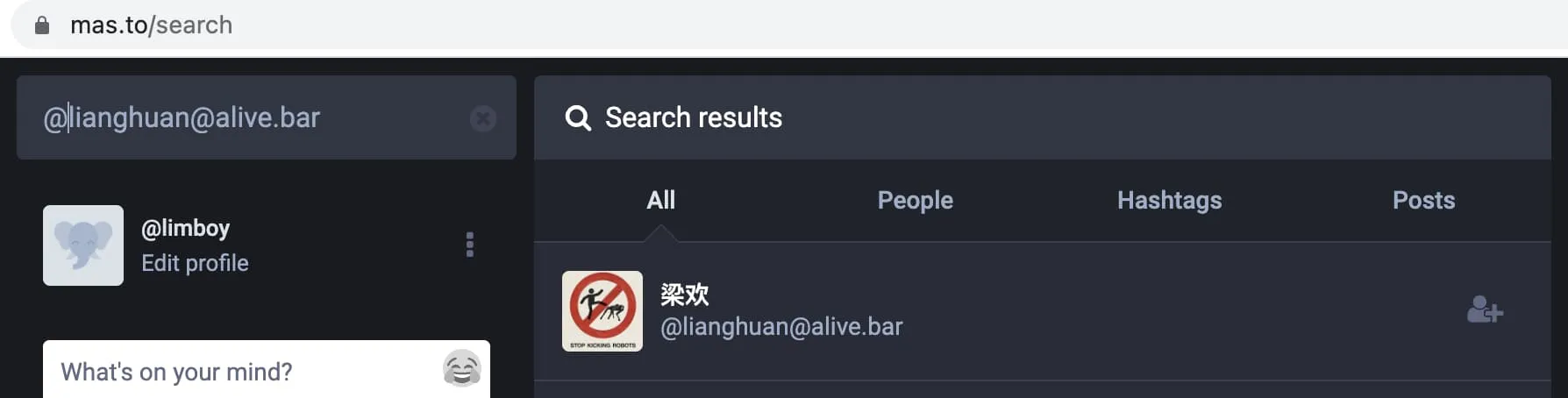 ,搜索这个 handle 就能找到对应的用户。比如我在 mas.to