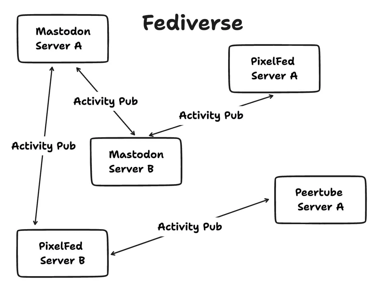 因为这些实例都实现了 ActivityPub 协议,所以它们之间可以互相通信,这些实例组合在一起,就形成了 Fediverse(联邦宇宙,Federation + Universe)。