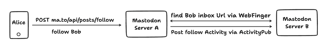是 post 内容。假如 Mastodon Server A(以下简称 MSA)上的用户 Alice,想要 follow Mastodon Server B(以下简称 MSB)上的用户 Bob,可以这么做: