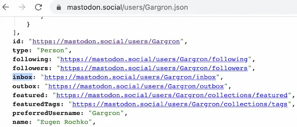 上的 inbox URL,可以请求 https://mastodon.social/users/Gargron.json,结果中就会有这个 inbox URL