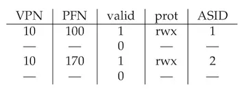 再来看看 Context Switch。每个进程的 VPN 和 PFN 的对应关系是不一样的,因此上一个进程的对应关系对于下一个进程来说,完全无用。那怎么办?最简单粗暴的方式就是进程切换时,直接清空,这样虽然不会出问题,但也降低了缓存命中率,尤其是频繁切换的话。还有一种方法是多加一个字段来表示该段翻译对应的是哪个地址空间(ASID),有点像 PID。