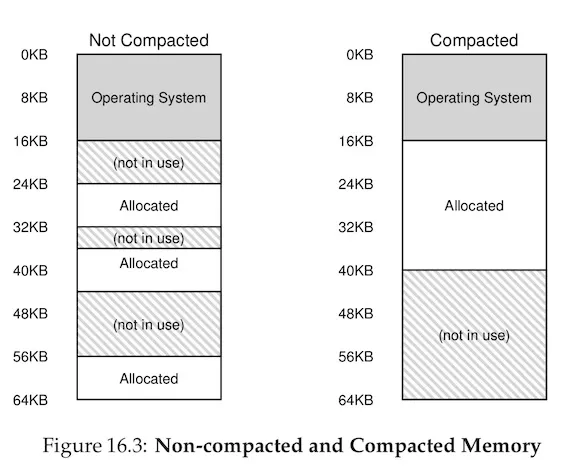 在这个例子中,当一个进程想要申请 20KB 的段时,虽然有 24KB 的剩余空间,但并不连续,因此会申请失败。一种解决方法是让内存空间变得更紧凑,比如暂停正在运行的进程,把内存拷贝到连续的地址空间,修改 Segment Register,这样就可以变成右图那样了。但是代价有点大,拷贝段会花费显著的时间。无论使用何种算法,碎片化一定会存在,只是好点的算法能降低碎片化程度。