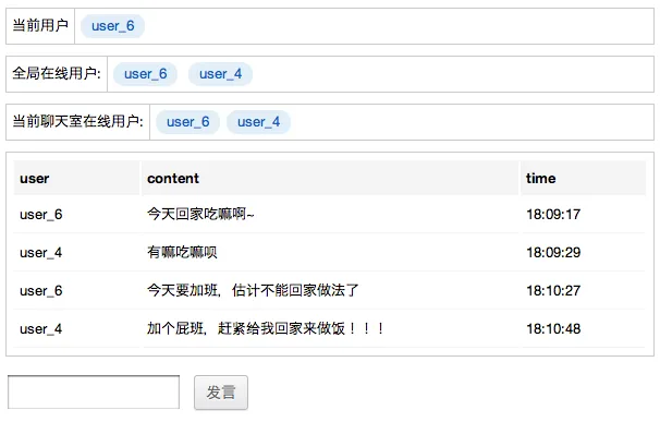 目前这个聊天室的功能还比较简单,可以实时更新全局在线用户,当前聊天室在线用户和聊天内容,都是通过一个 ajax 长连接实现的。在这个连接里定义了需要实时的内容,相应的内容一旦在服务端更新,可以马上推送到各个客户端。