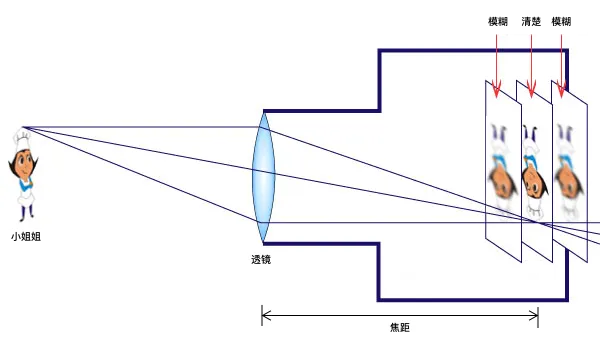 人眼跟相机有点类似,相机的成像原理是反射在物体上的光通过透镜投射到后面的感光元件上。这里有一个焦距的概念,下面中间那张清楚的图片到透镜的距离就是焦距(真实比例的焦距会短很多),在焦距前后的图像就会模糊(离得越远越模糊)。