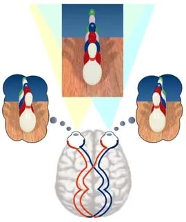 我们对周围世界的视觉感知主要依赖从视网膜所提取的信息,以及中枢神经系统对这些信息的解释。外部的光线投射到视网膜上时是平面的,为什么看起来世界是立体的呢?这跟眼睛的分布有关,我们的眼睛在脸的左右,两边的视网膜产生的图像会有细微的差异,中枢神经系统会根据这些差异计算出事物与我们的距离并构建出一个三维世界(也可以用两张有细微差异的图片来「欺骗」大脑,从而看到三维的效果)。所以我们获得到的视觉信息是二维的,但在大脑的运算下又多了一维。