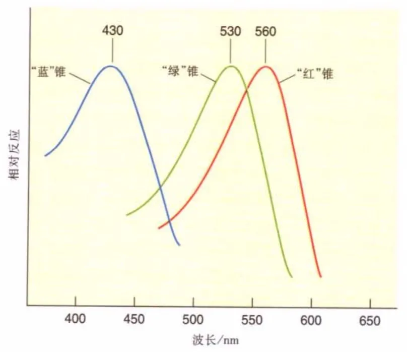 这两类细胞分别具有不同的超能力,视锥细胞负责捕捉颜色,视杆细胞对光线更敏感(弱光环境下主要靠它了)。我们有三种视锥细胞,蓝锥、绿锥和红椎,分别对蓝光、绿光和红光最敏感(严格说来是让特定波长的电磁波可以对应到特定的颜色,所以世界本无颜色,只有不同频段的电磁波,人眼将其中的一部分「翻译」成了颜色)。