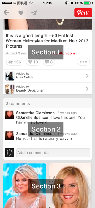 通过 objection 实现依赖注入后,就能更好地实现 SRP(Single Responsibility Principle),代码更简洁,心情更舒畅,生活更美好。拿 Pinterest 来说,下面的页面就可以划分为 3 个 Section。