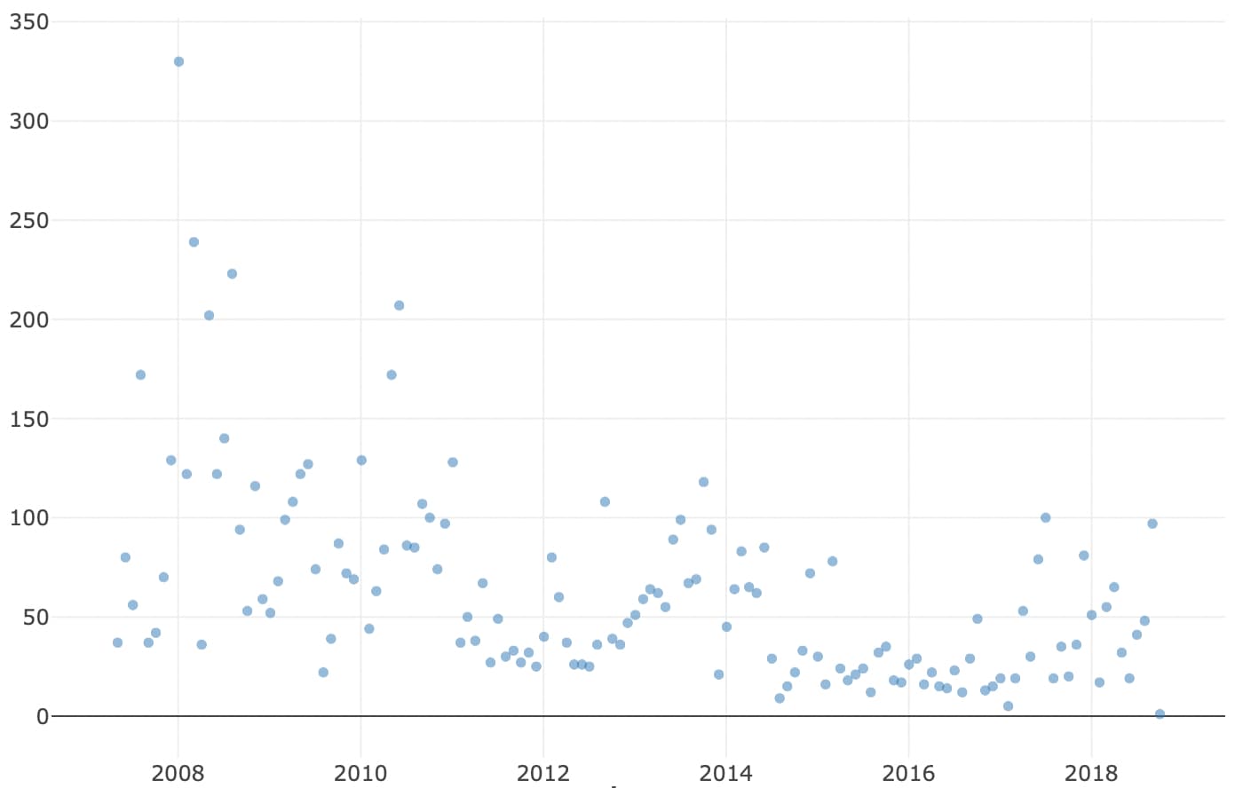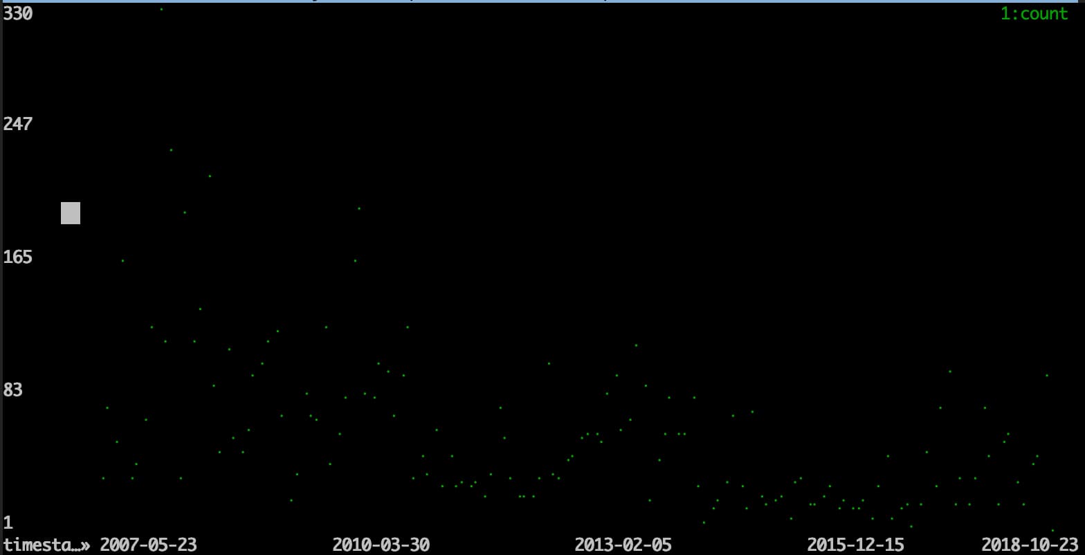 VisiData 还支持散点图,我们可以通过这个功能来看每个月的发推数量,不过显示的效果不太好。