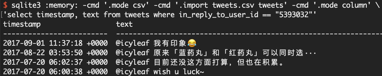 csv2sqlite tweets 'select * from tweets limit 1'
