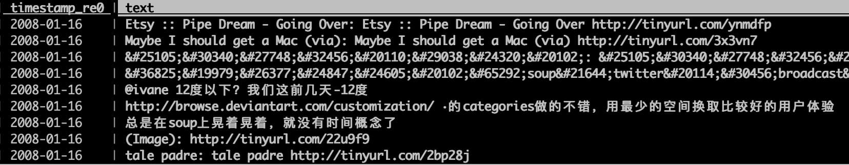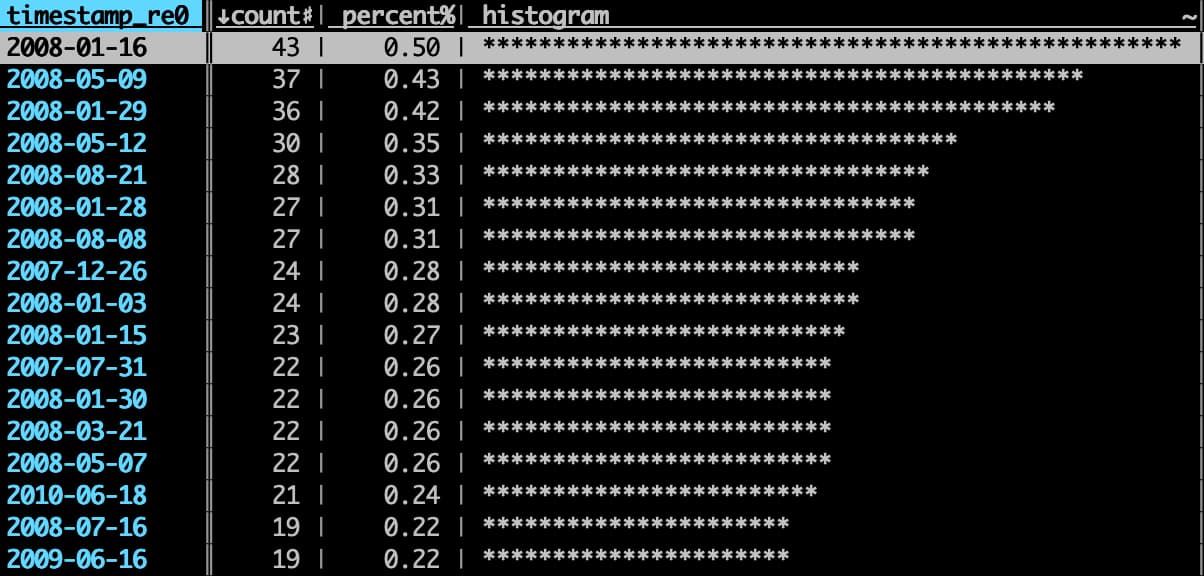找到了发推最多的日子后,接下来很自然就想看看这几天自己都发了些啥,比如我想看 2008-01-16 这一天的推,先选择日期列,然后输入快捷键 |,表示要选择符合正则表达式的行,此时 status bar 会提示输入正则,输入 2008-01-16 后回车,就能选中这些行了。