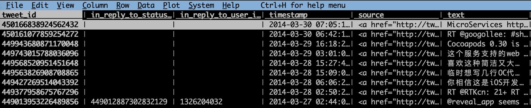 VisiData 安装完后,直接 vd tweets.csv 就可以了,界面如下: