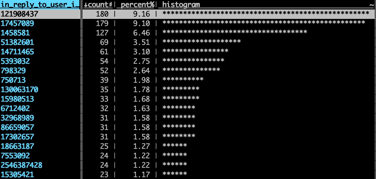 或者看自己 @ 频率最高的是哪些人:(这里显示的是 user_id,可以通过 user_id 转 username 的服务来看对应的人)