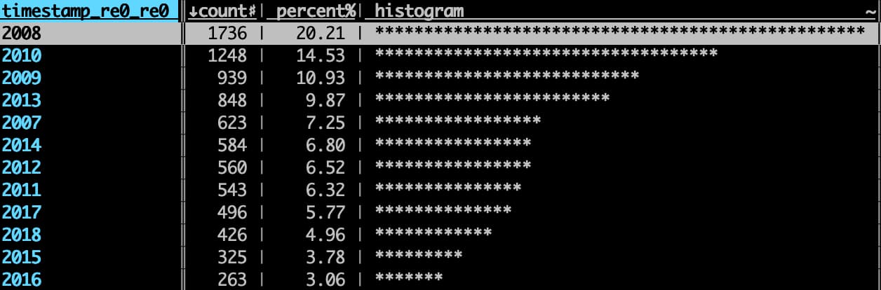 VisiData 是一个开源项目,有 5 年多的历史了,还在持续维护着,可信任程度还是比较高的。以上是我的简单探索,已经可以满足不少需求了。一开始我对 TUI (Terminal UI) 是有点抗拒的,感觉不如 GUI 美观,但结合 Terminal 的操作确实太方便了,之后如果有不太复杂的数据分析需求,应该还会选择 VisiData。