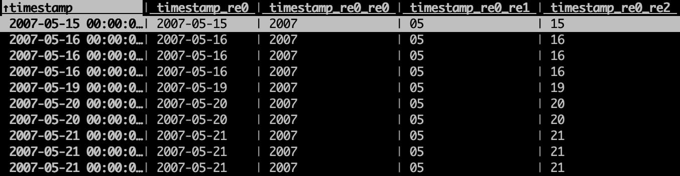 其中有一列为 timestamp,包含了 date 和 time,我们需要将 Year 分离出来,然后才能进行聚合操作。分离的过程也很简单,先选中 timestamp 这一列,输入快捷键 : 就会进入到正则切分模式,输入空格 ,就可以将 date 和 time 分开了,然后再对 date 列执行同样的操作,不过要用 - 来切分,这样就能得到 Year 了。
