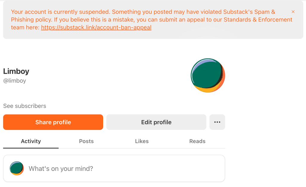 这就是自建博客的意义,用别人的平台,你不知道这把达摩克利斯之剑什么时候会落下来。substack 上我只是当时在试用功能时,发过一篇简短的文章,结果就被判为 Spam & Phishing,连账号都被 ban 了。